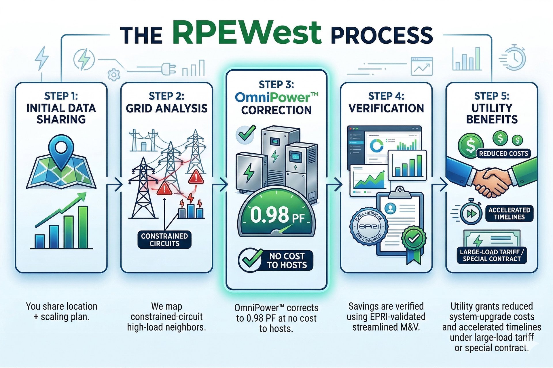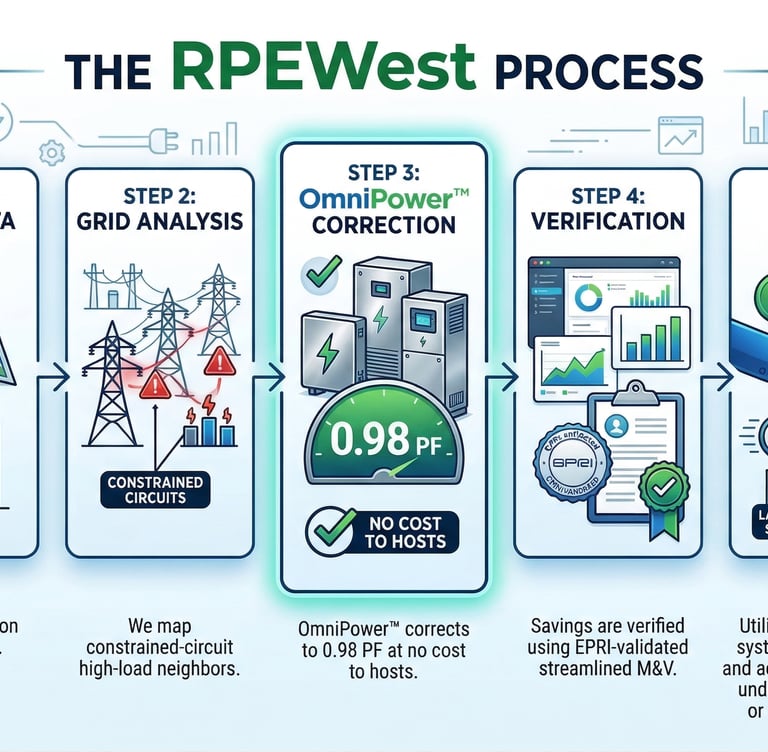 The Solution: RPEWest unlocks 8–40% more usable capacity on existing infrastructure through customer-funded Non-Wires Alternatives (NWAs). We find savings using our process with OmniPower™ installations at local high-load facilities; utilities recognize the savings in their IRP and DSM portfolio.