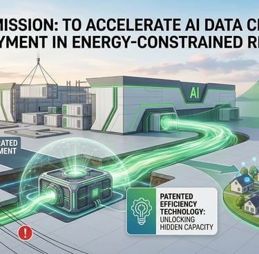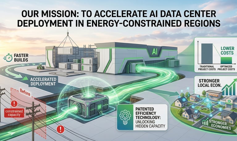 Our mission: To accelerate AI data center deployment in energy-constrained regions by unlocking hidden grid capacity through patented efficiency technology — delivering faster builds, lower costs, and stronger local economies.